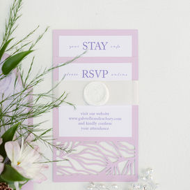 The invitation suite introduced the celebration through layered materials, soft lavender tones, and delicate graphic structure.